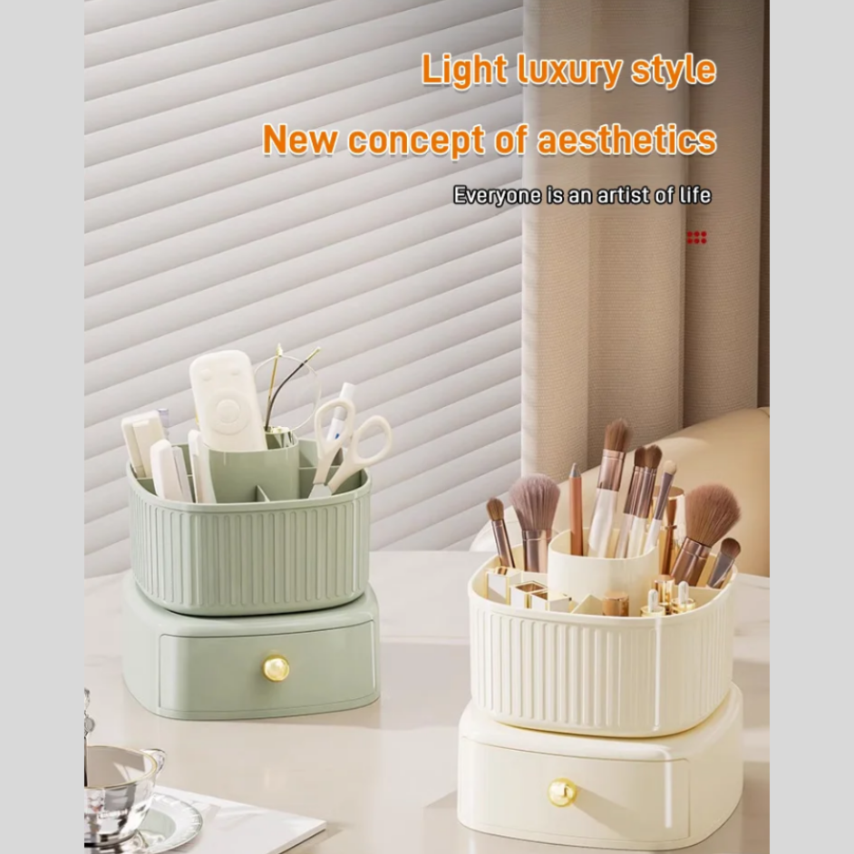 The Double Rotating Makeup Brush Organizer is truly multifunctional. It serves as both a storage solution and a decorative piece for your beauty space. Its rotating upper section maximizes accessibility, while the lower drawer adds extra storage capacity. This multifunctional design ensures that all your beauty essentials are within reach and neatly organized.