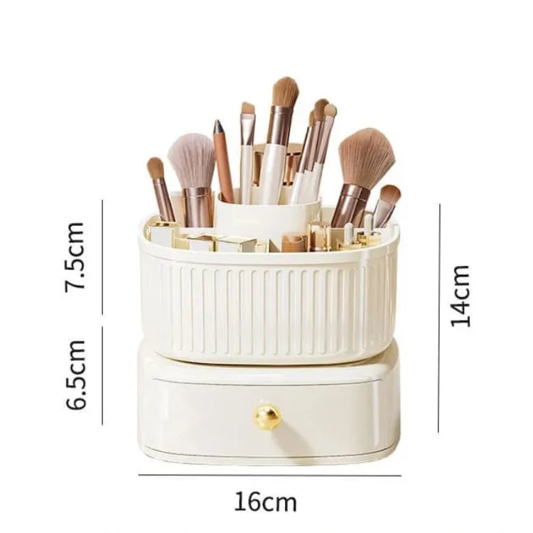 The Double Rotating Makeup Brush Organizer is truly multifunctional. It serves as both a storage solution and a decorative piece for your beauty space. Its rotating upper section maximizes accessibility, while the lower drawer adds extra storage capacity. This multifunctional design ensures that all your beauty essentials are within reach and neatly organized.